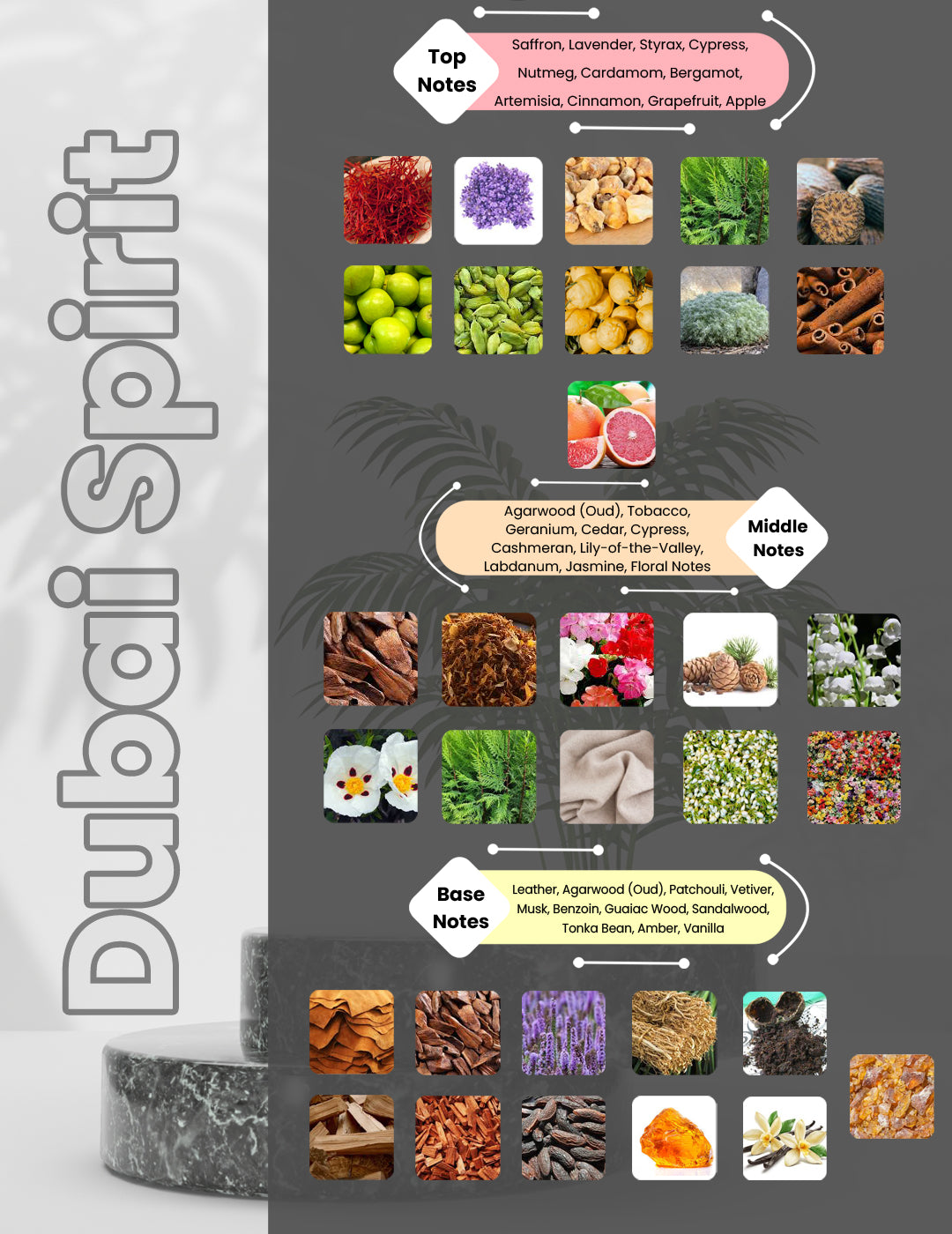 Meydan by The Spirit of Dubai is a fragrance for women and men. Meydan was launched in 2015. Top notes are Saffron, Lavender, Styrax, Cypress, Nutmeg, Cardamom, Bergamot, Artemisia, Cinnamon, Grapefruit and Apple; middle notes are Agarwood (Oud), Tobacco, Geranium, Cedar, Cypress, Cashmeran, Lily-of-the-Valley, Labdanum, Jasmine and Floral Notes; base notes are Leather, Agarwood (Oud), Patchouli, Vetiver, Musk, Benzoin, Guaiac Wood, Sandalwood, Tonka Bean, Amber and Vanilla.