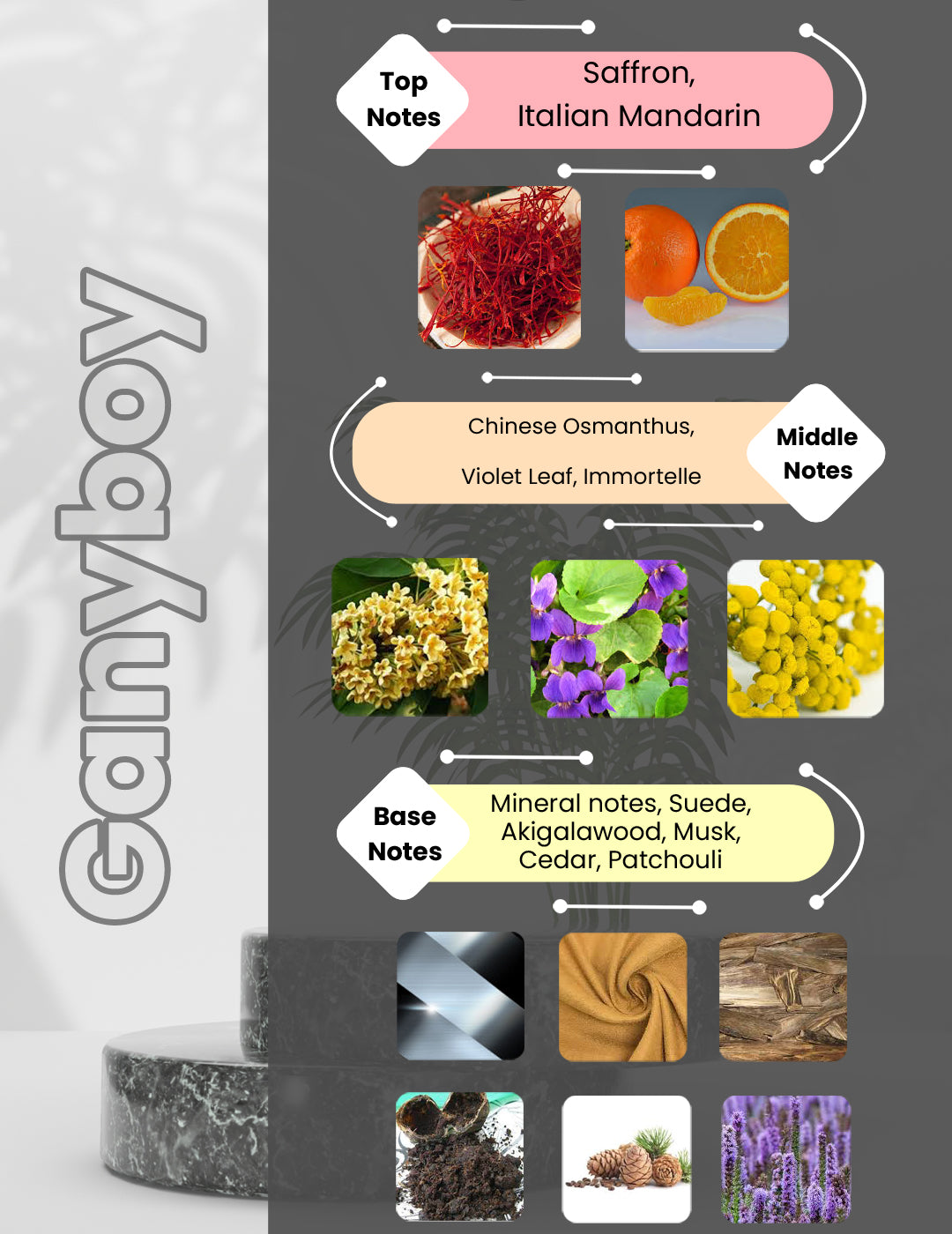 Ganymede by Marc-Antoine Barrois is a Woody Spicy fragrance for women and men. Ganymede was launched in 2019. The nose behind this fragrance is Quentin Bisch. Top notes are Saffron and Italian Mandarin; middle notes are Chinese Osmanthus, Violet Leaf and Immortelle; base notes are Mineral notes, Suede, Akigalawood, Musk, Cedar and Patchouli..