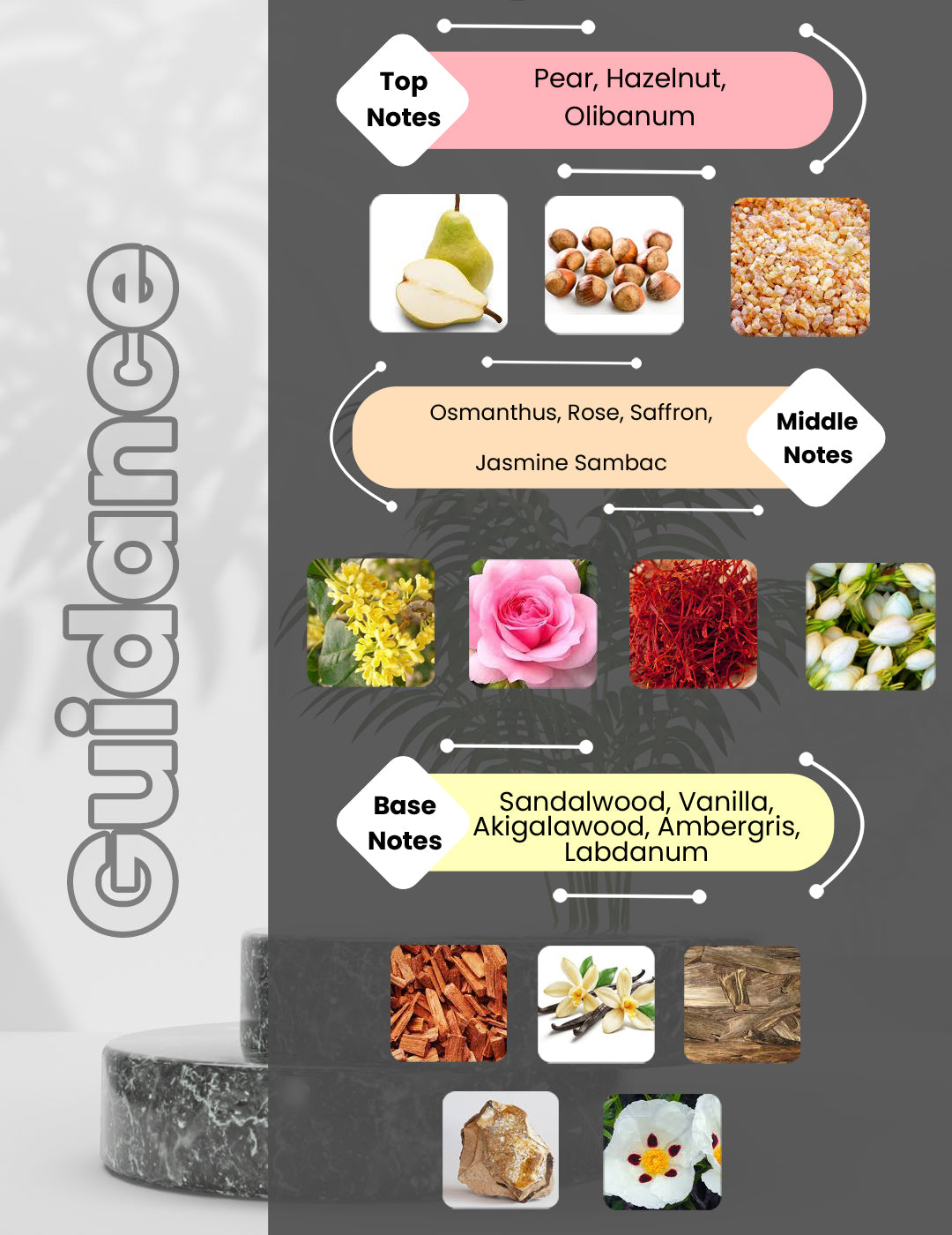 Guidance by Amouage is a Floral Fruity fragrance for women and men. This is a new fragrance. Guidance was launched in 2023. The nose behind this fragrance is Quentin Bisch. Top notes are Pear, Hazelnut and Olibanum; middle notes are Osmanthus, Rose, Saffron and Jasmine Sambac; base notes are Sandalwood, Vanilla, Akigalawood, Ambergris and Labdanum.