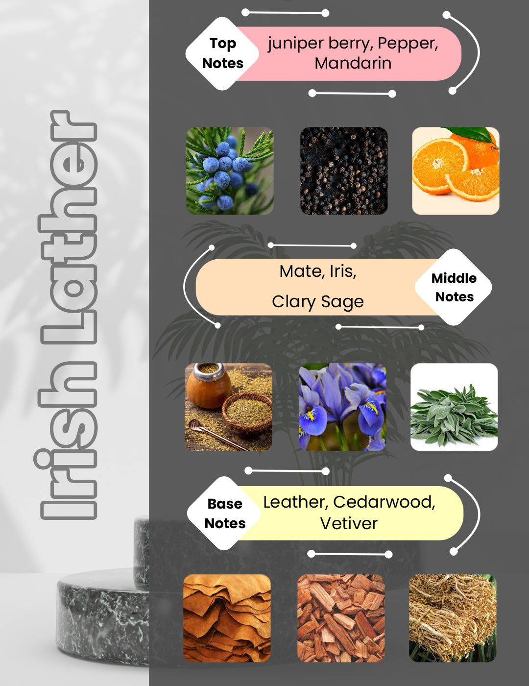 Irish Leather by Memo Paris is a Leather fragrance for women and men. Irish Leather was launched in 2013. The nose behind this fragrance is Alienor Massenet. Top notes are juniper berry, Pepper and Mandarin; middle notes are Mate, Iris and Clary Sage; base notes are Leather, Cedarwood and Vetiver.