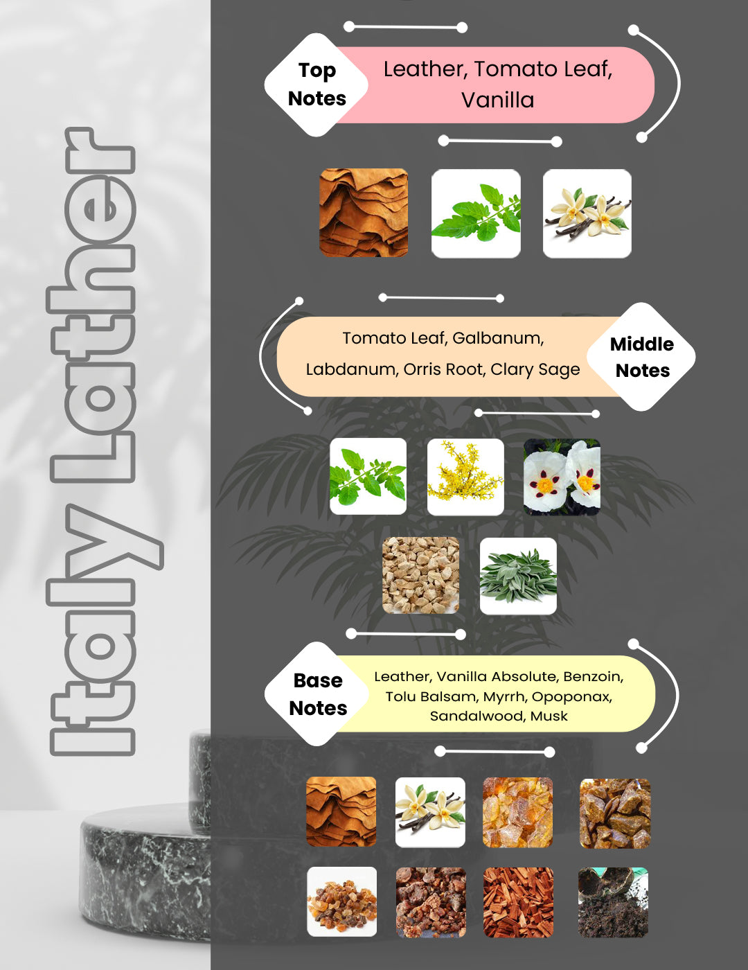 Italian Leather by Memo Paris is a Leather fragrance for women and men. Italian Leather was launched in 2013. The nose behind this fragrance is Alienor Massenet. Top notes are Leather, Tomato Leaf and Vanilla; middle notes are Tomato Leaf, Galbanum, Labdanum, Orris Root and Clary Sage; base notes are Leather, Vanilla Absolute, Benzoin, Tolu Balsam, Myrrh, Opoponax, Sandalwood and Musk.