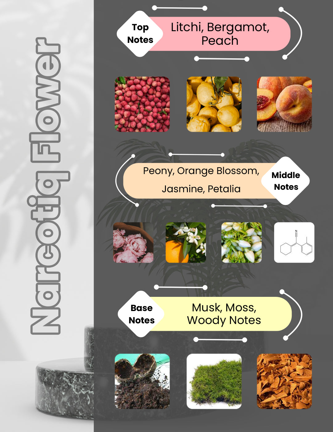 Fleur Narcotique by Ex Nihilo is a Floral Fruity fragrance for women and men. Fleur Narcotique was launched in 2014. The nose behind this fragrance is Quentin Bisch. Top notes are Litchi, Bergamot and Peach; middle notes are Peony, Orange Blossom, Jasmine and Petalia; base notes are Musk, Moss and Woody Notes.
