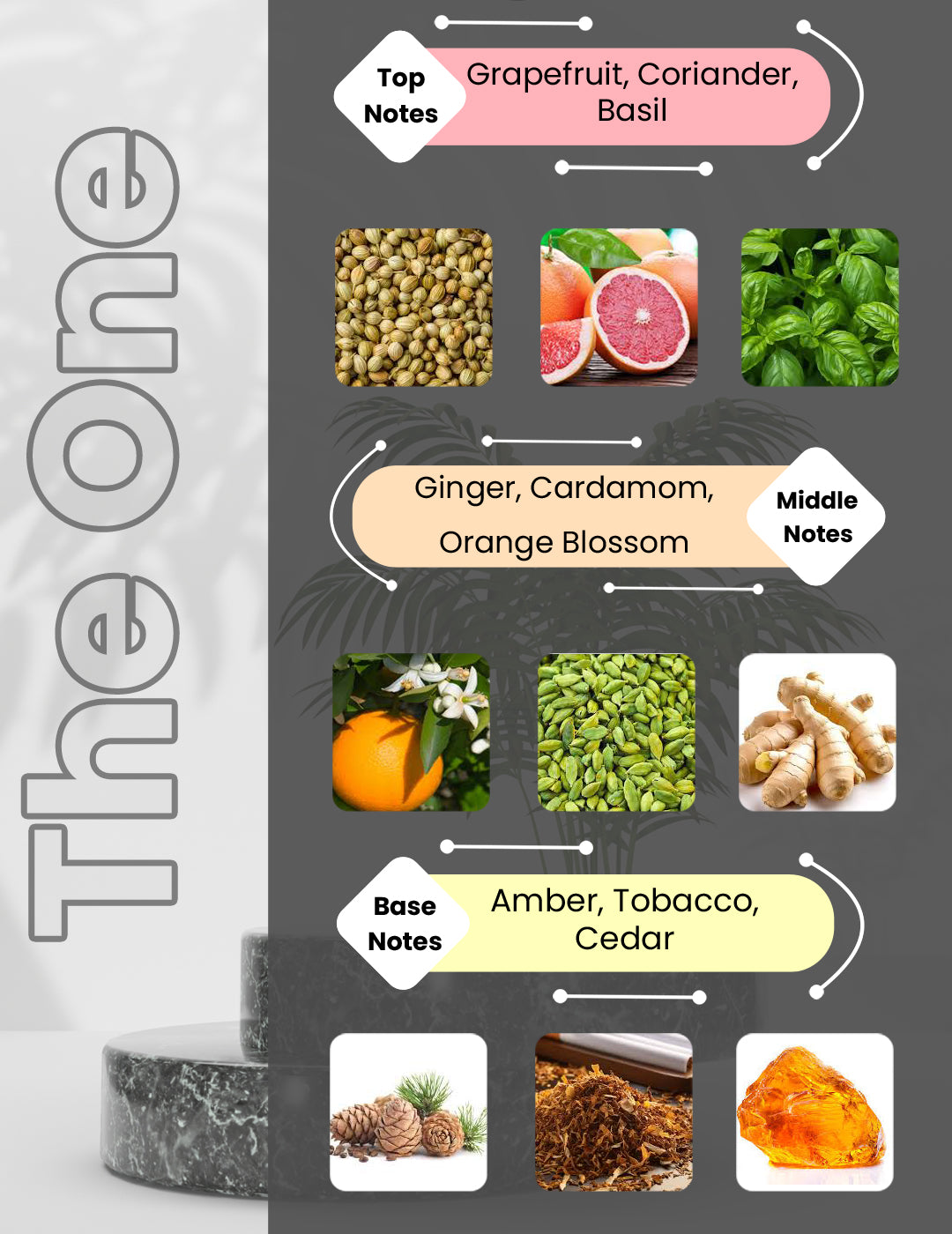 The One for Men by Dolce&Gabbana is a Woody Spicy fragrance for men. The One for Men was launched in 2008. The nose behind this fragrance is Olivier Polge. Top notes are Grapefruit, Coriander and Basil; middle notes are Ginger, Cardamom and Orange Blossom; base notes are Amber, Tobacco and Cedar.