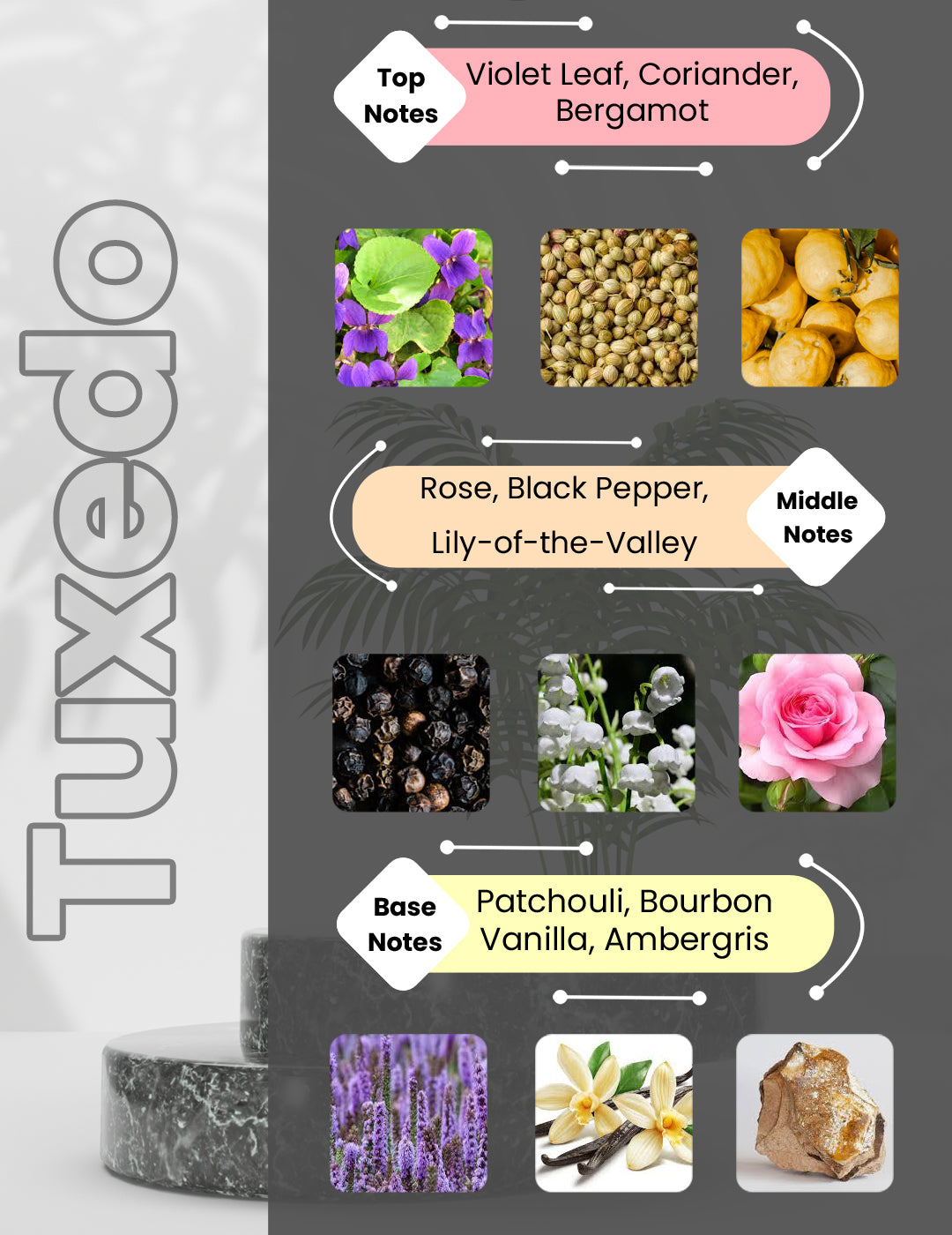 Tuxedo by Yves Saint Laurent is a Chypre fragrance for women and men. Tuxedo was launched in 2015. The nose behind this fragrance is Juliette Karagueuzoglou. Top notes are Violet Leaf, Coriander and Bergamot; middle notes are Rose, Black Pepper and Lily-of-the-Valley; base notes are Patchouli, Bourbon Vanilla and Ambergris.